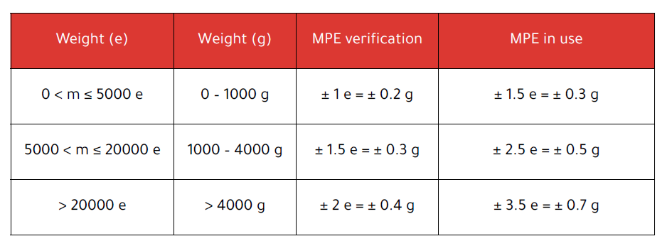 - Up to 1000 g (≤ 5000 e): MPE verification = ±0.2 g, in use = ±0.3 g