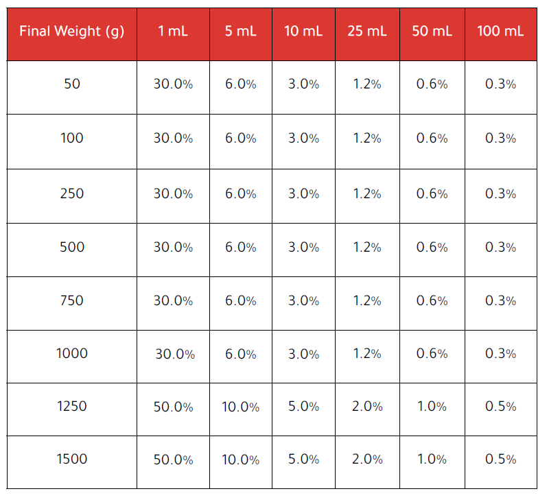 The following table shows how the relative error (%) varies depending on total weight and added volume, using in-service MPE values: