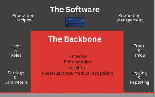 All our technology has one shared layer of basic building blocks: firmware, robot motion, weighing, photo/barcode/product recognition. Using the same basic and patented building blocks makes sure that all our current and future compounding solutions work as one system under one workflow management software.