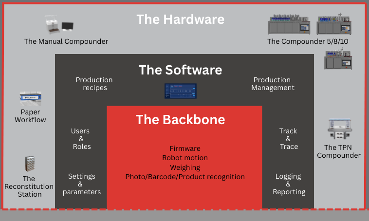Compounding of parenteral medication is a complex environment. From the vial spikes and bags a pharmacy or hospital uses up until the interface with the hospital information system: a lot of factors are at play. We want to make sure you can run all your compounding activities from one software system, that is connect to the outside world through one communication module. To make a complex environment easy to manage.